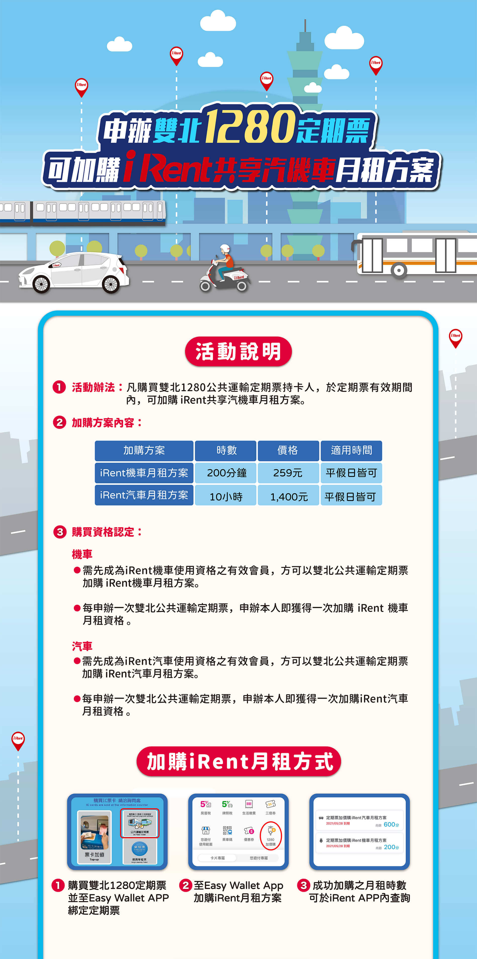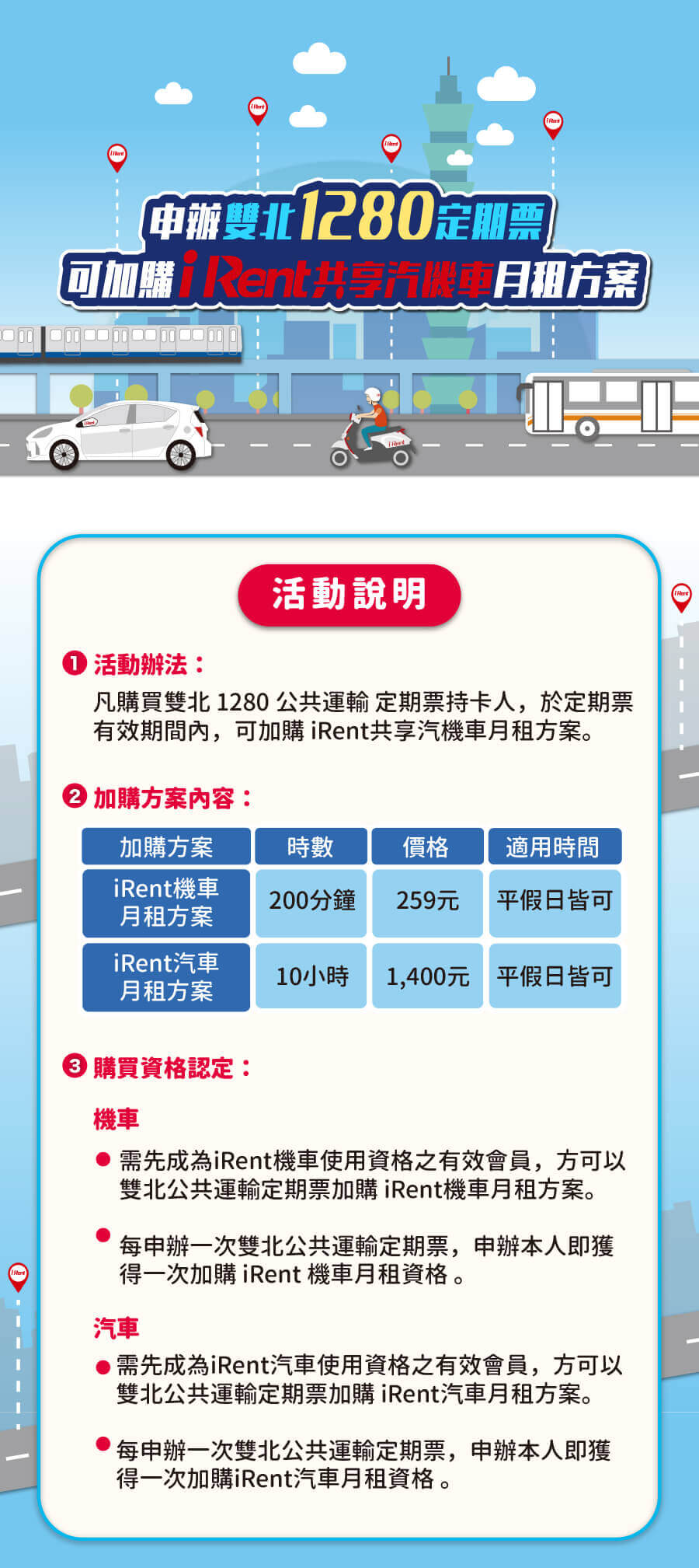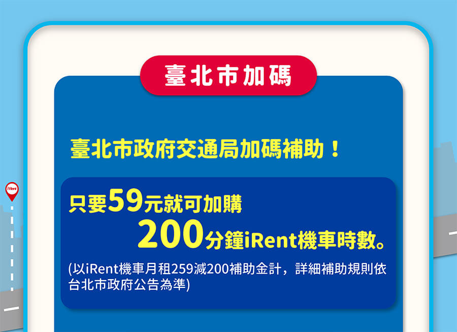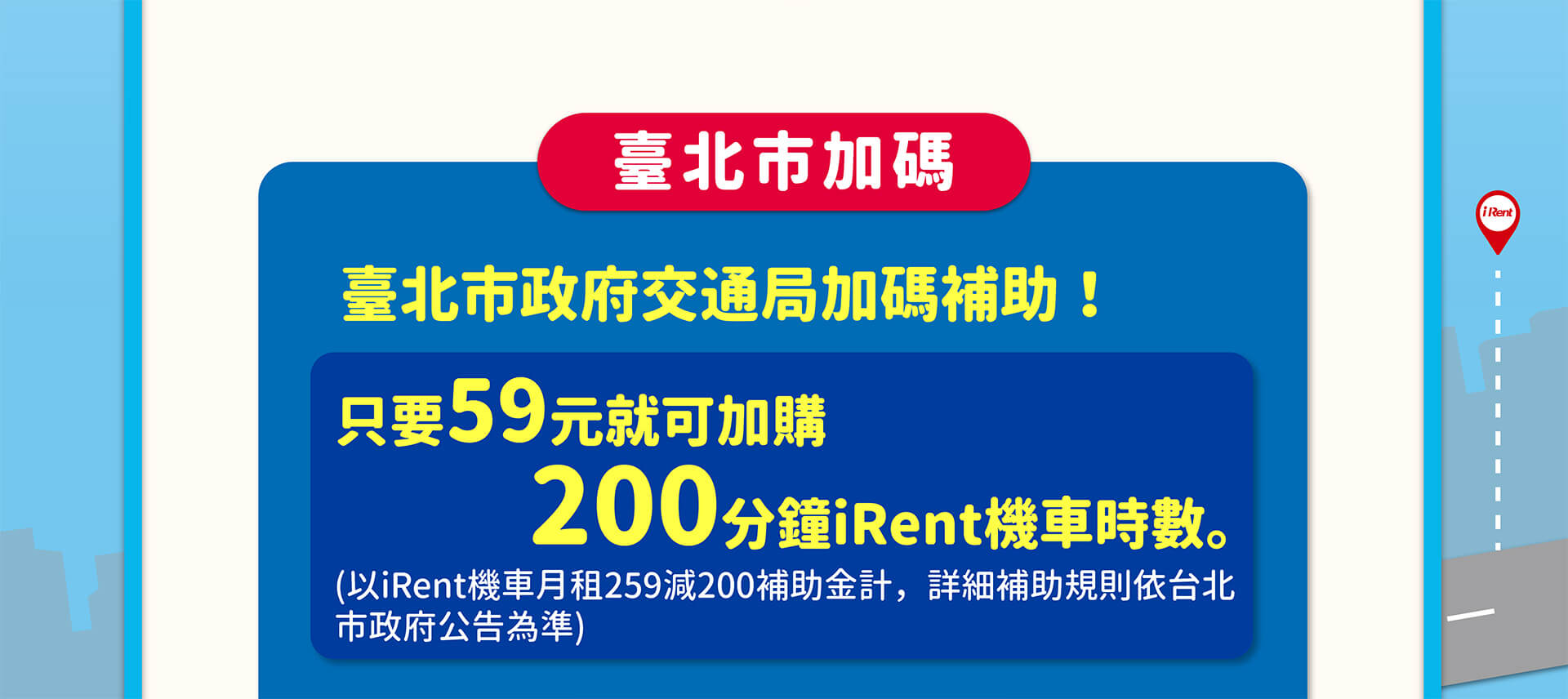 • 加價購之iRent汽車月租方案僅提供優惠價格予民眾加價購買,並無納入臺北市政府交通局補助資格。