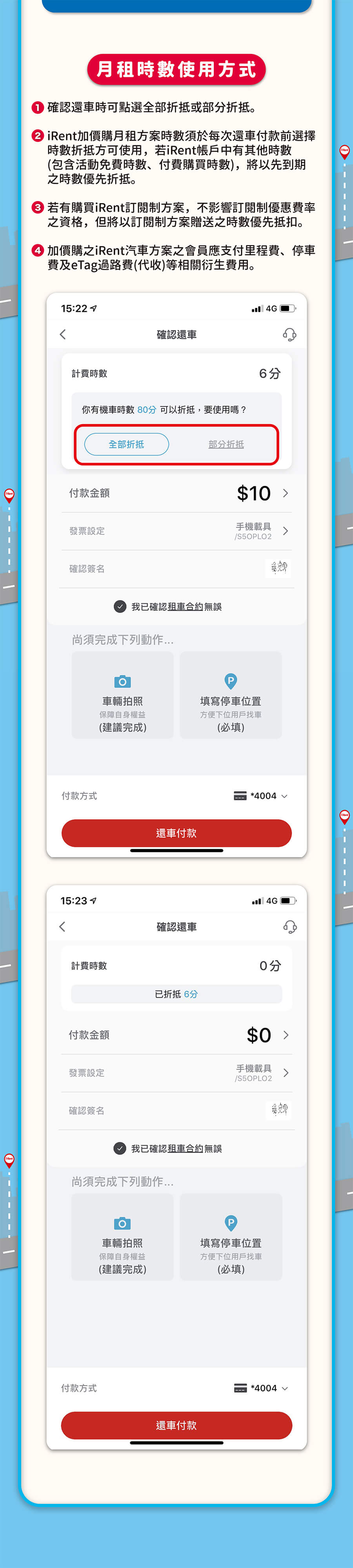 • 若有購買iRent訂閱制方案,不影響訂閱制優惠費率之資格,但系統優先折抵訂閱制方案之時數。