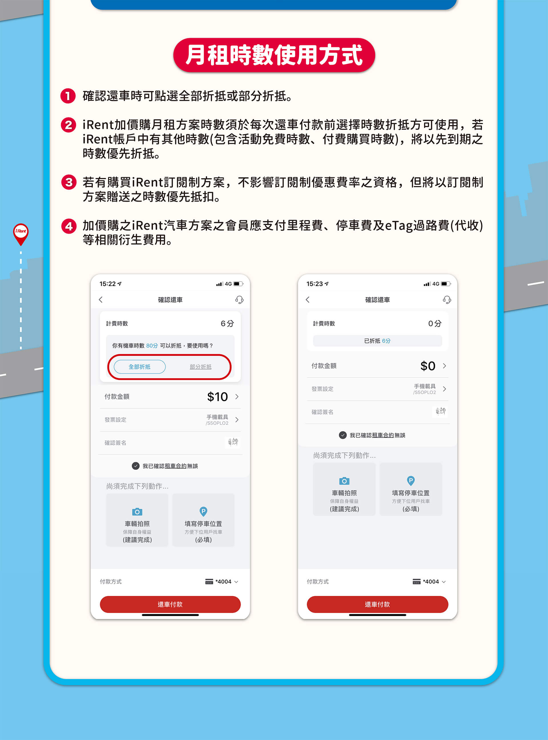 • iRent加價購汽車/機車月租方案時數須於每次還車付款前選擇時數折抵方可使用,若iRent帳戶中有其他可供折抵時數(包含活動免費時數、付費購買時數),系統先以最近到期日的時數優先進行抵扣。