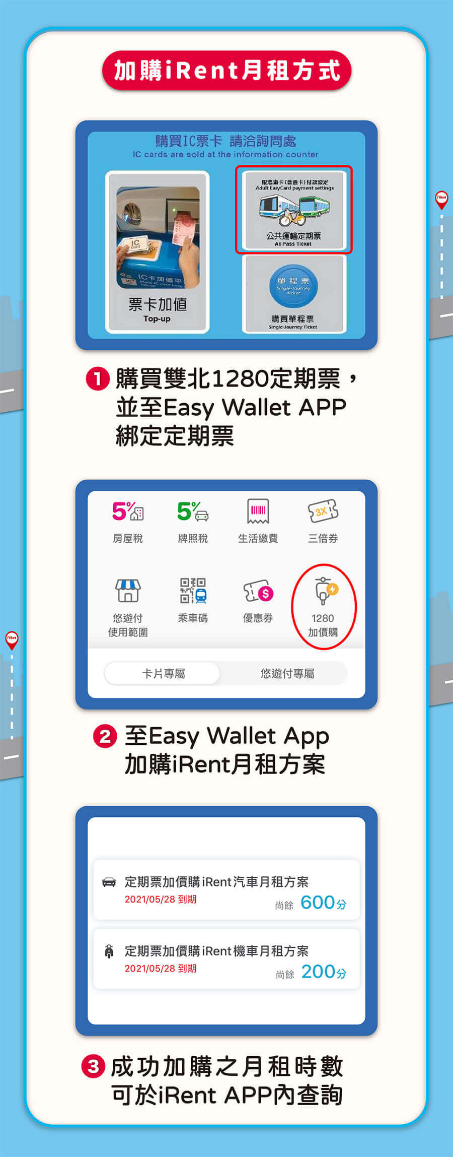 • 加價購之iRent汽車月租方案僅提供優惠價格予民眾加價購買,並無納入臺北市政府交通局補助資格。